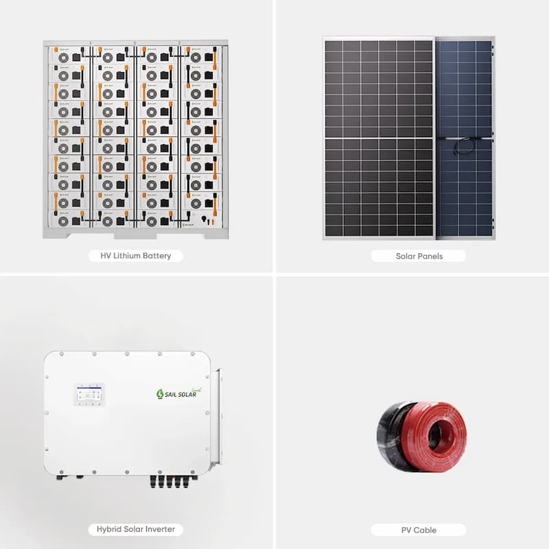SAS100KW-HYSail Solar ofrece soluciones integrales de almacenamiento solar para aplicaciones residenciales, comerciales e industriales. Su sistema solar híbrido de alto rendimiento de 100 kW cuenta con almacenamiento de baterías escalable de 100 kWh o 200 kWh, un inversor híbrido para una integración simplificada y alta eficiencia, una transición fluida entre conexión y desconexión de la red para un funcionamiento sin interrupciones durante cortes de energía, y modos de operación programables para optimizar el autoconsumo, el respaldo o la reducción de picos de demanda. Esto la convierte en la solución energética perfecta para la industria y el comercio.