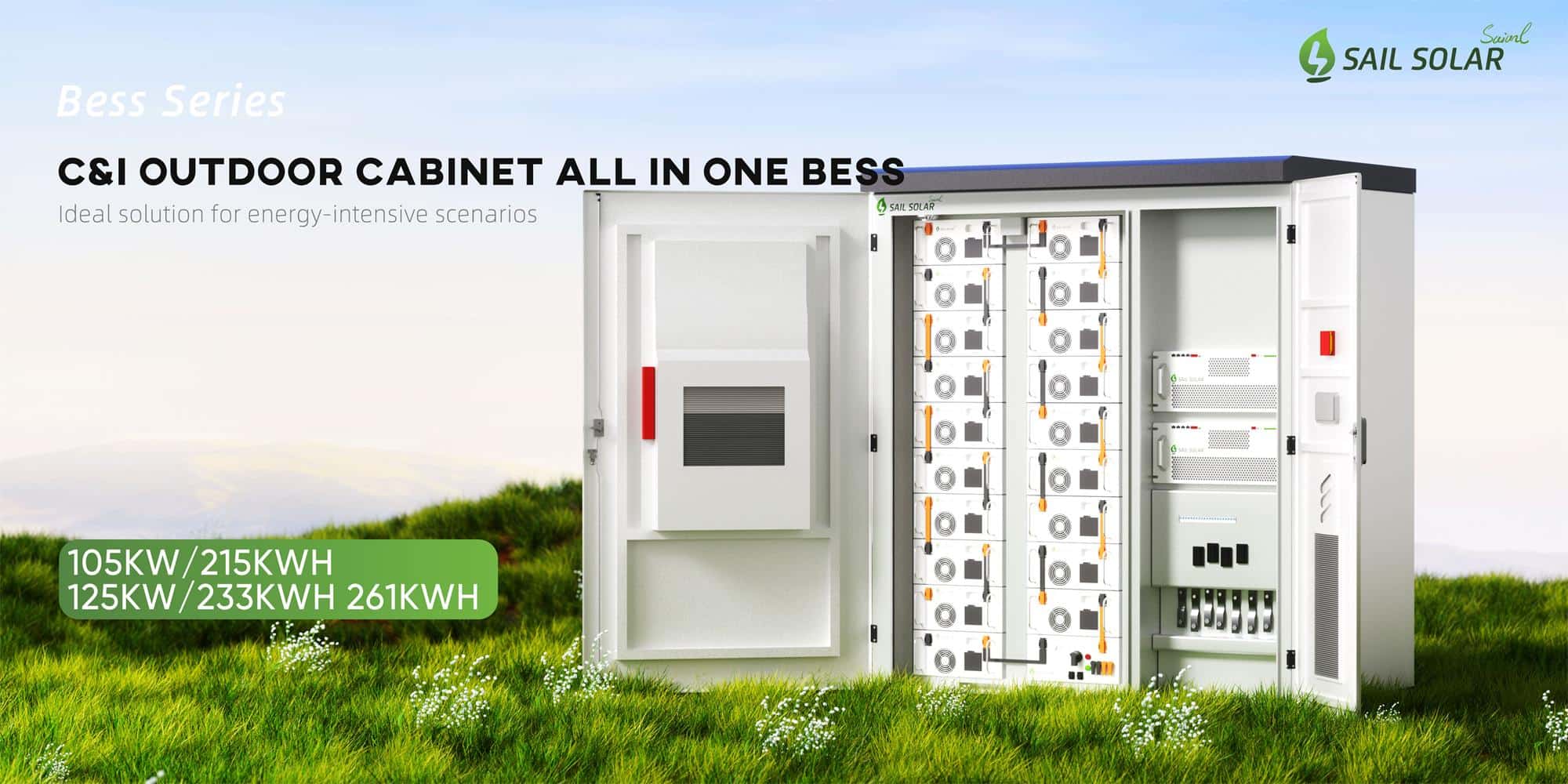 Solución híbrida de almacenamiento solar PCS de 105 kW/125 kW con batería de litio BESS de 215 kWh/233 kWh/261 kWh y armario exterior.