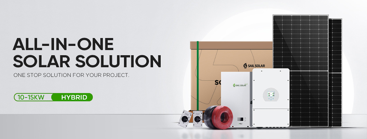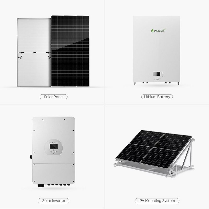 SAS10KW-HYEl sistema híbrido solar Sail Solar de 10 kW se compone de 18 paneles solares de 550 vatios, un inversor híbrido de 10 kW y una o más baterías de litio de 10 kWh. Las baterías son esenciales si se consume electricidad con frecuencia durante la noche.