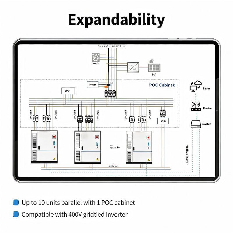 Se pueden conectar hasta 10 unidades en paralelo: Un único gabinete POC admite hasta 10 gabinetes de sistema de almacenamiento de energía (ESS) de 418 kWh conectados en paralelo, con una capacidad total máxima del sistema de 4,18 MWh. Esto permite un inicio a pequeña escala y una expansión gradual en función del aumento de la demanda de energía, evitando una inversión inicial excesiva.